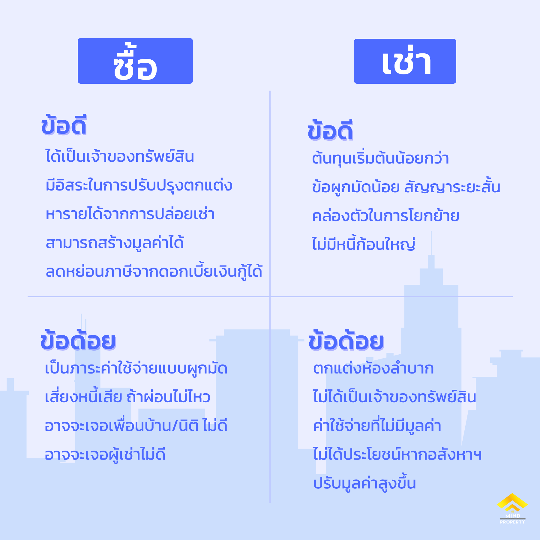 ตอนนี้ก็ถือว่าเป็นช่วงที่โควิดกำลังเป็นไปในทางที่ดีขึ้น จึงทำให้ใครหลายๆคนเริ่มอยากที่จะบริหารใช้สอยเงินกันบ้างแล้วหล่ะ เพื่อนๆหลายๆคนที่ตกงานก็กำลังเริ่มที่จะหางานทำแล้วใช่ไหมละคะ แต่เมื่อได้งานแล้ว เราก็ต้องหาที่พักอีก เพื่อนๆหลายๆคนคงจะกำลังมองหาคอนโดอยู่ใช่ไหมคะ แต่หลายๆคนก็จะได้ยินมาว่า ราคาเช่าก็เท่ากับราคาซื้อ ทำไมไม่ซื้อไปเลยล่ะ จะได้มีทรัพย์สินเป็นของตัวเองเลย ทางเรา MIND Property ขอเบรกไว้ก่อนคะ ยังมีอีกหลายปัจจัยในการตัดสินใจว่าจะซื้อเลยหรือจะแค่เช่าดี นั้นเราไปดูกันเลยดีกว่าคะ